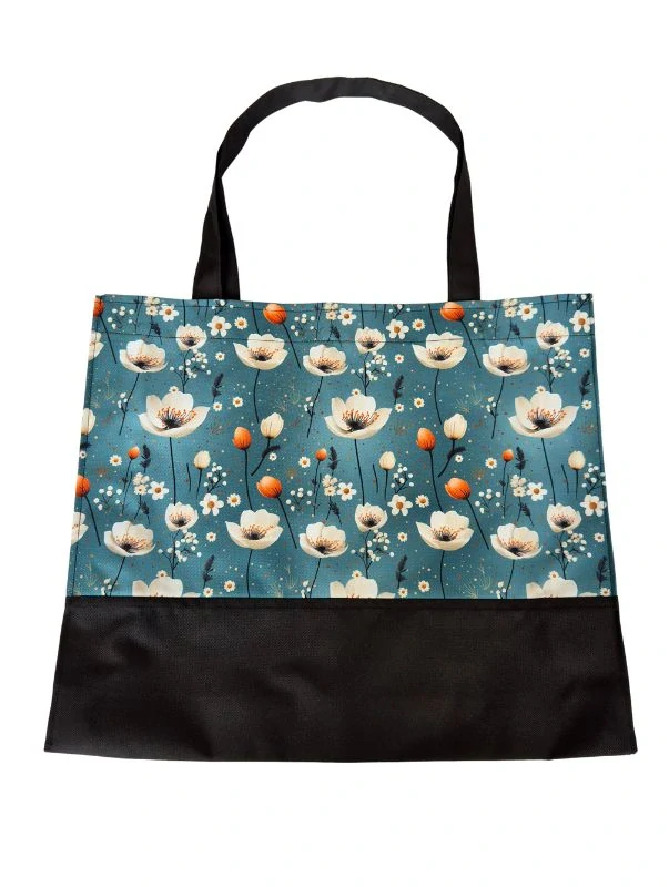 Tato taška je zdobená elegantním květinovým vzorem na modro-zeleném podkladu. Jemné krémové květy s oranžovými pupeny a drobnými bílými kvítky vytvářejí harmonický a nadčasový design. Černá spodní část dodává tašce kontrast a praktičnost. Ideální volba pro každodenní nošení i jako stylový doplněk. S rozměry 45 cm na šířku a 37 cm na výšku (+/- 1 cm) a praktickým odšitým dnem a boky o šířce 10 cm je ideální na velké nákupy, ale také může sloužit jako stylová plážová taška.